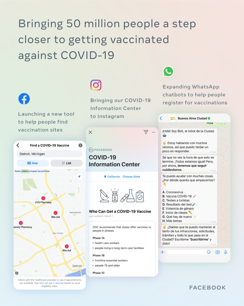 Anche Whatsapp avrà un ruolo cruciale in questa campagna di Facebook per favorire le vaccinazioni. Fino ad oggi sono stati circa 3miliardi i messaggi diffusi da governi, organizzazioni non profit e organizzazioni internazionali ai cittadini tramite i chatbot WhatsApp ufficiali su COVID-19. Ora la piattaforma sta lavorando direttamente con le autorità sanitarie e i governi per ottenere la registrazione delle persone per le vaccinazioni, sempre tramite un chatbot nella applicazione di messaggistica.