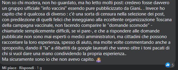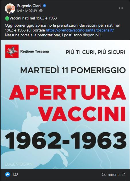 Alla fine di aprile, il presidente della Regione Toscana, Eugenio Giani, ha aperto un gruppo Facebook “Info Vaccini Toscana” attraverso cui informare i cittadini sulla campagna vaccinale in corso. Ad oggi, 12 maggio, il gruppo ha superato i 20mila membri e quasi 900 post pubblicati.